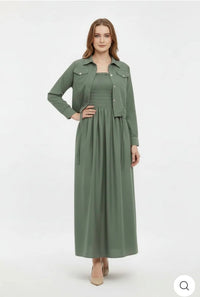 The smocked bodice offers a flattering fit while ensuring all-day comfort, flowing seamlessly into a graceful, full-length silhouette. The matching coat, detailed with front buttons and subtle pocket accents, adds a polished western edge, making this ensemble ideal for casual outings, brunch dates, or semi-formal occasions.