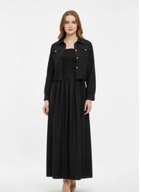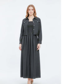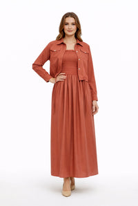 Elevate your everyday elegance with the Western Smocking Coat Maxi (W-712) — a perfect blend of comfort, structure, and modern femininity. Crafted in a rich earthy brown tone, this outfit features a beautifully smocked maxi dress paired with a lightweight western-style coat for a refined layered look.